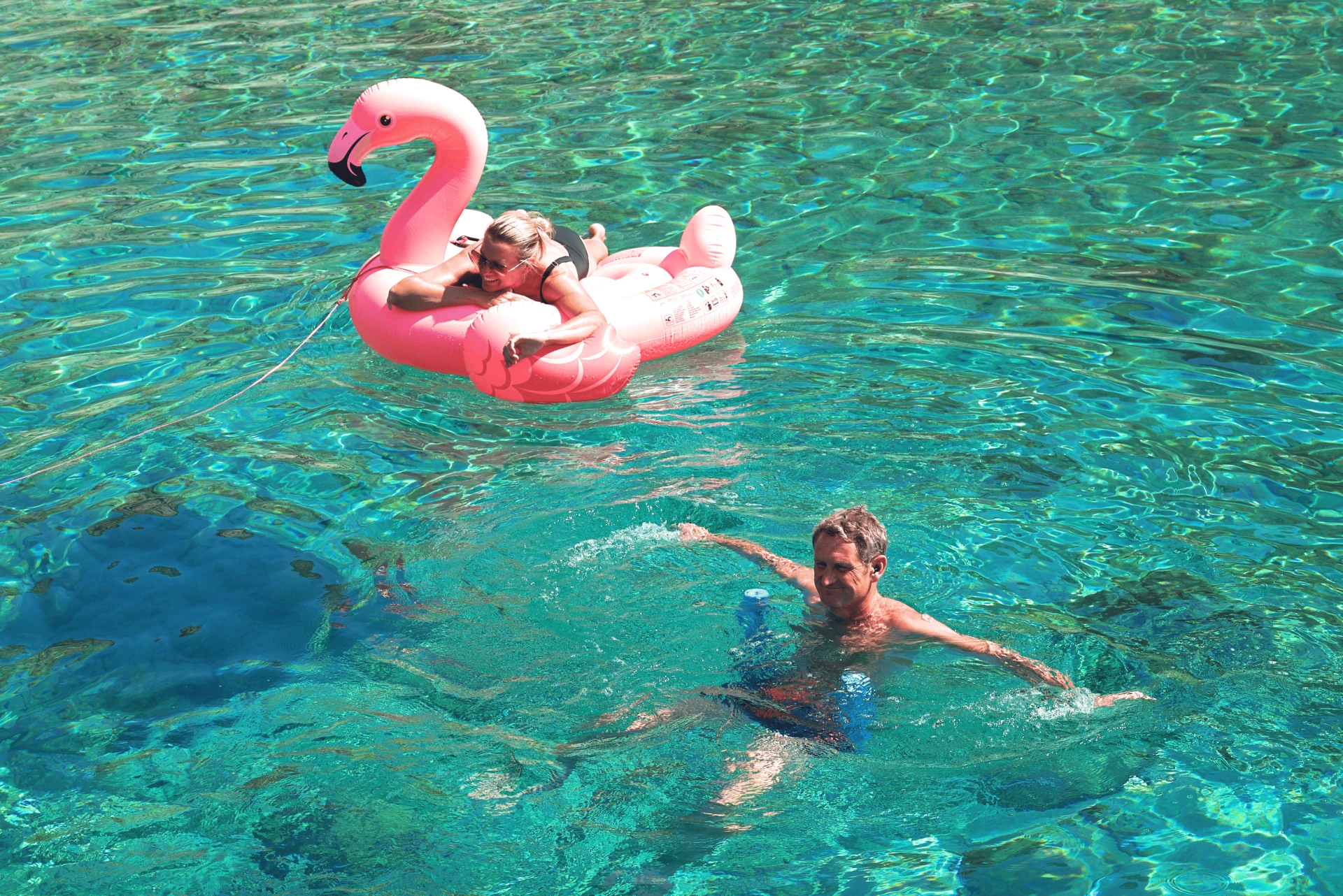 Once everything is ready, it’s time for fun! The sea becomes your playground — slide down the inflatable water slide, zip across the bay on a sea scooter, glide over the waves on a water tube, or explore at your own pace by kayak or SUP. Adventure and relaxation await — jump in and make unforgettable memories! Or simply grab a mask and fins to discover the vibrant underwater world beneath you. And of course, our pink flamingo float is waiting for your next great photo moment.